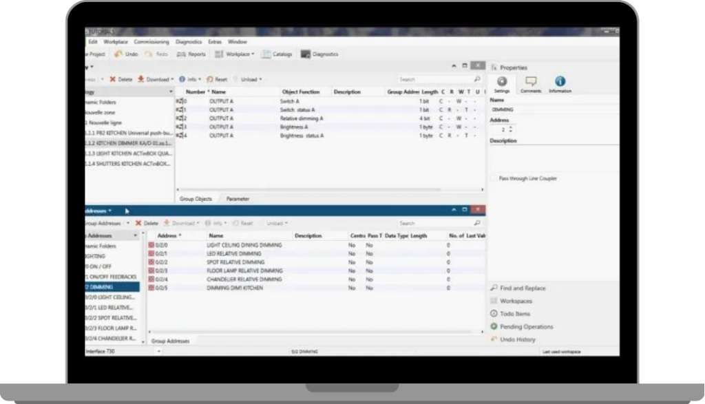 Wgrywamy aplikacje na każde urządzenie, parametryzujemy je i tworzymy logikę połączeń za pomocą adresów grupowych. ETS pozwala na precyzyjne zarządzanie systemem, umożliwiając tworzenie zaawansowanych rozwiązań w automatyce budynkowej.